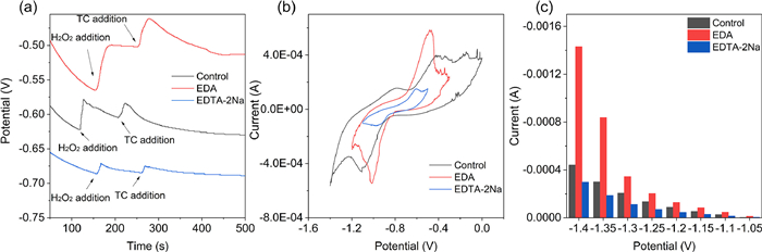 The effect of nucleophilic reagent, electrophilic reagent, H2O2 and TC on the electron transfer in solution was investigated by measuring the open-circuit voltage of the solution using an electrochemical workstation. Fig. 7a depicts the variation of open-circuit voltage in the solution. The addition of nucleophilic reagent EDA makes the open-circuit voltage higher than that of the blank group without the addition of complexing agent. The results indicate that the addition of EDA does promote electron transfer in the solution, resulting in a decrease in the relative potential between positive and negative electrodes [34]. The addition of electrophilic reagent EDTA-2Na decreases the open-circuit voltage compared to the blank group, so the addition of EDTA-2Na impedes the electron transfer and leads to an increase in the potential between the positive and negative electrodes. Fig. 7a shows that, the open circuit voltage increases with the addition of H2O2 and TC, indicating that the addition promotes the transfer of electrons to reduce the potential. In addition, H2O2 and TC have stronger effect on the increase of the open circuit voltage in the presence of the nucleophilic reagent EDA. That is to say, the ability to promote the transfer of electrons is stronger in the presence of the nucleophilic reagent.