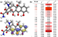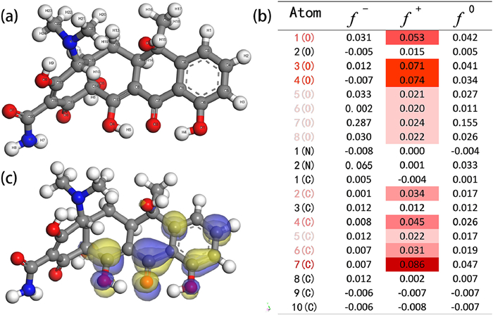 | Fig. 8. Chemical structure (a), LUMO diagram (b) (Yellow corresponds to positive and blue to negative regions of wave functions) and Fukui index (c) of TC. | |