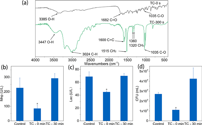 | Fig. 9. FTIR spectra (a) and biotoxicity (manganese enzyme activity of white rot fungus (b) and laccase activity of white rot fungus (c) and CFU of E. coli (d)) of TC before and after degradation. | |