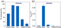 | Fig. 1. Removal rate (a) and pseudo-first-order rate constant (b) of TC 10 min in different co-existing organic compounds by ZVI/H2O2 system. Reaction conditions T = 30 ℃, pH 6, ZVI dosage = 50 mg/L, [H2O2] = 50 µmol/L, the amount of co-existing organic matter = 3 mmol/L. | |