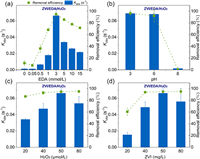 | Fig. 3. Parameters optimization of TC degradation by ZVI/EDA/H2O2 system: (a) EDA dosage, (b) initial pH of ZVI/EDA/H2O2 system, (c) H2O2 concentration and (d) ZVI dosage. | |