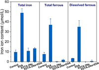 | Fig. 5. Effects of different complexing agents on iron ion dissolution in ZVI/H2O2 system. Reaction conditions: T = 30 ℃, pH 6, ZVI = 50 mg/L, [H2O2] = 50 µmol/L, EDA = 3 mmol/L. | |