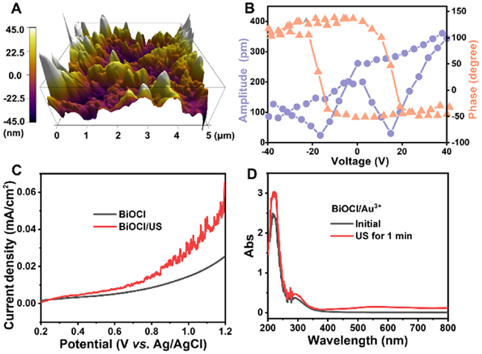| Fig. 1. (A) AFM topography, (B) PFM phase hysteresis loops and amplitude hysteresis, (C) Piezo-current density versus potential curve, (D) UV–vis spectra of BiOCl and Au-BiOCl, US refers to ultrasonic vibration. | |