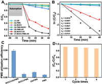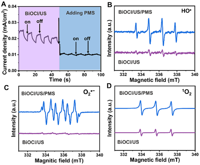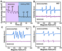 | Fig. 2. (A) Transient piezo-current profiles without and with PMS. Electron paramagnetic resonance spectra of (B) HO•, (C) O2•− and (D) 1O2 in piezocatalytic system and piezo-activated PMS system. | |