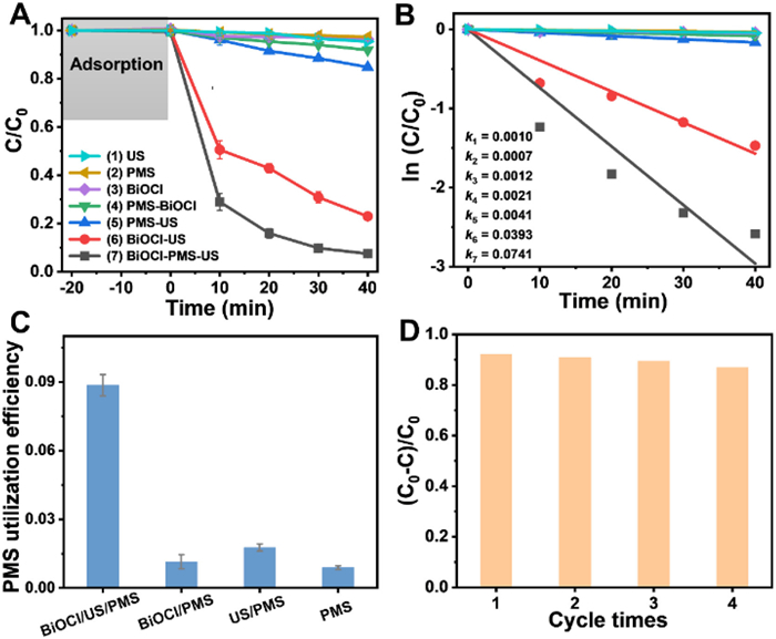 | Fig. 3. (A) Degradation efficiencies and (B) kinetic fittings of CBZ as a function of reaction time in different systems. (C) PMS utilization efficiency in different systems. (D) Recycling tests of CBZ degradation in BiOCl piezo-activated PMS process. Conditions: [CBZ] = 5 mg/L, [BiOCl] = 0.5 g/L, [PMS] = 1 g/L, US refers to ultrasonic vibration with 40 kHz and 100 W. | |