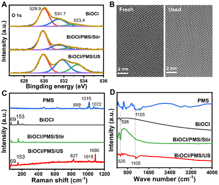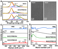 | Fig. 4. (A) XPS spectra of O 1s, (B) STEM of fresh and used BiOCl, (C) Raman spectra of BiOCl or PMS, (D) FTIR spectra of BiOCl or PMS. | |