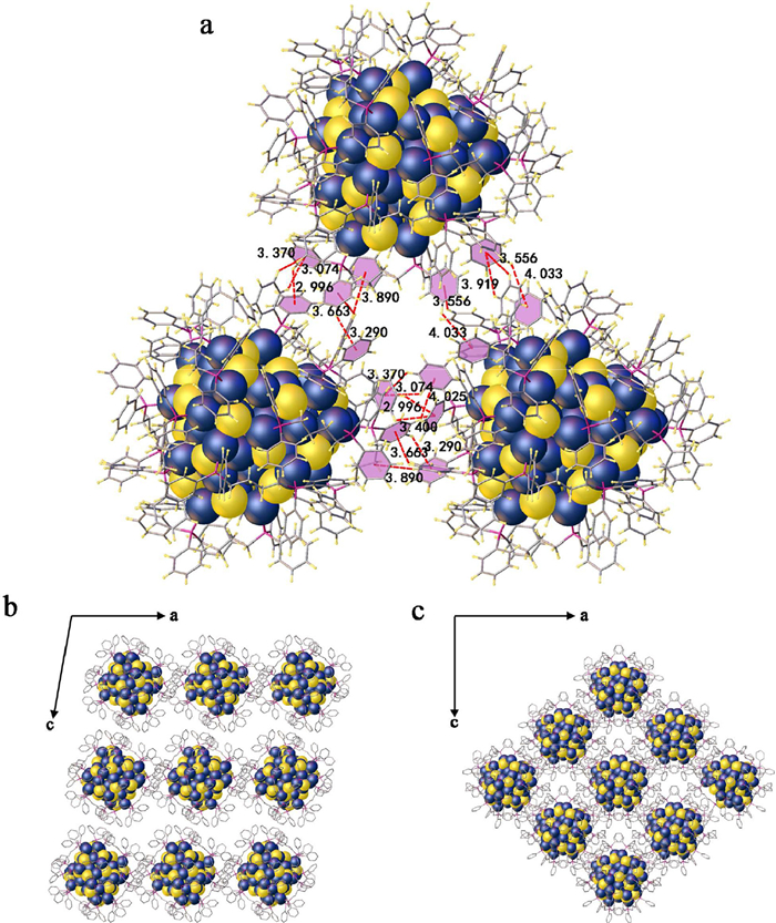 | Fig. 3. (a) The intermolecular C−H···π interactions (Å) between dppb ligands of adjacent clusters in 1 (phenyl groups with interactions are highlighted in pink). (b, c) Cluster packing patterns along the b axis of 1 (C2/c) and 3 (I4). Color codes: Ag, dark blue; S, yellow; P, purple; C, gray; Hydrogen atoms are omitted for clarity. | |