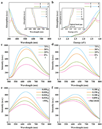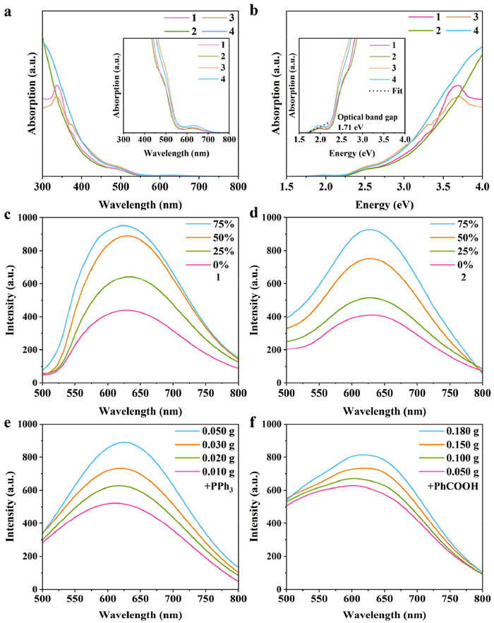 | Fig. 4. (a, b) UV-vis spectra of 1−4. Emission spectra of (c) 1 and (d) 2 (dissolved in THF and MeOH, and the volume fraction of THF is 0%, 25%, 50%, and 75%, respectively; all excited by 480 nm light). (e, f) Emission spectra of 2 (added different quality of PPh3) and 2 (added different quality of PhCO2H). | |