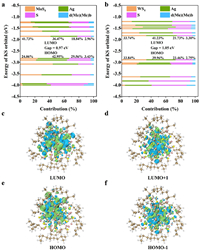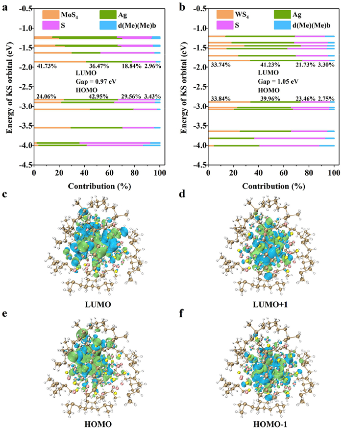 To gain further insight into the PL mechanism, we performed density functional theory (DFT) calculations employing the ORCA 5.0.3 program [47] and Multiwfn 3.8 program [48]. In these calculations, the phenyl groups present in the dppb ligands were selectively replaced with methyl groups to reduce computational costs. Fig. 5 and Fig. S13 (Supporting information) provide the results obtained, revealing HOMO−LUMO band gaps of 0.97 eV for 1 and 1.05 eV for 2, consistent with the value of 1.2 eV reported for the eight-electron Au25(SMe)18 cluster [49]. Comparative analysis further indicates that 1 and 2 exhibit similar arrangements of electron clouds in their Kohn-Sham orbitals, as well as contributions from different components to the LUMO and HOMO. The PL mechanism is attributed to the MS4 (M = Mo or W) → Ag charge transfer process, which is modified by the presence of outer S2− ions and dppb ligands within the crystal structure.