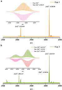 | Fig. 1. Experimental isotope distributions of selected peaks for (a) 1 and (b) 2 (positive ion mode, dissolved in CH3OH and CH3CN). | |