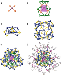 | Fig. 2. (a) MoS42− anion template. (b) Cup-like [MoS4@Ag12]2+ kernel (MoS4 tetrahedra are highlighted in pink). (c) "Wind blade"-like Ag9S5 unit of Ag46S24 shell. (d) "Windmill" shaped Ag46S24 shell. (e) Multishelled core architecture of [MoS4@Ag12@Ag46S24] skeleton. (f) Overview of the total structure of [MoS4@Ag12@Ag46S24(dppb)12]. Color codes: Mo, brown; Ag, green and dark blue; S, orange and yellow; P, purple; C, gray; Hydrogen atoms are omitted for clarity. | |