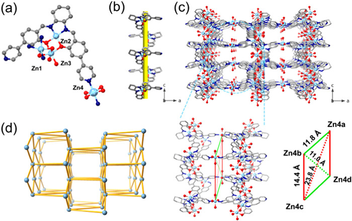 | Fig. 1. The crystal structure of R-1: (a) Coordination environment of the Zn2+ centers; (b) right-handed (P)21 helical chain along the c axis; (c) view of the 3D framework along the b axis (top) and a parallelogram-shaped cavity by four Zn4 atoms (down), and (d) acs topology. Color codes: Zn, cyan; C, gray; O, red; N, blue; H, omitted. | |