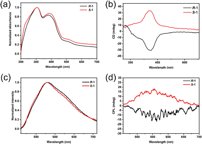 | Fig. 2. (a) Solid-state UV–vis absorption spectra, (b) ECD spectra, (c) normalized emission spectra, and (d) CPL spectra of R-1 and S-1. | |