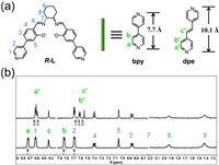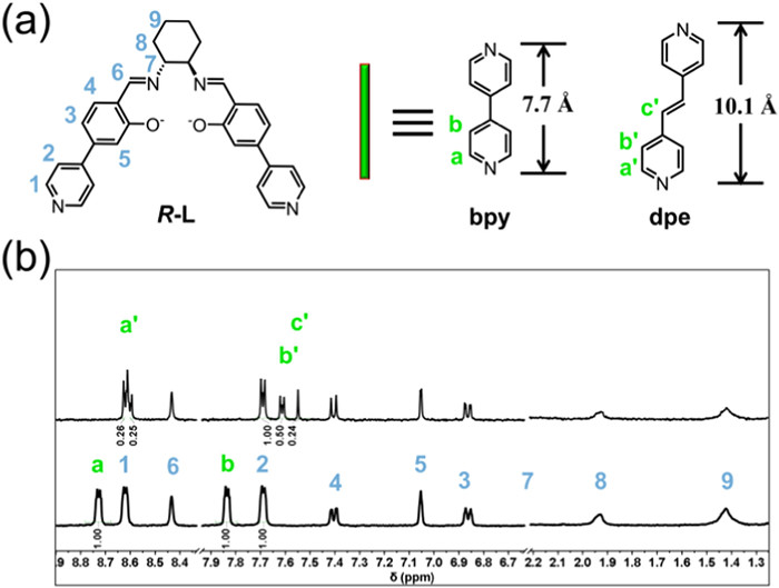 | Fig. 3. (a) Ligand R-L and the secondary linkers for the post-synthetic installation in R-1. (b) 1H NMR spectra of the digested samples of R-2dpe (top) and R-2bpy (down). | |