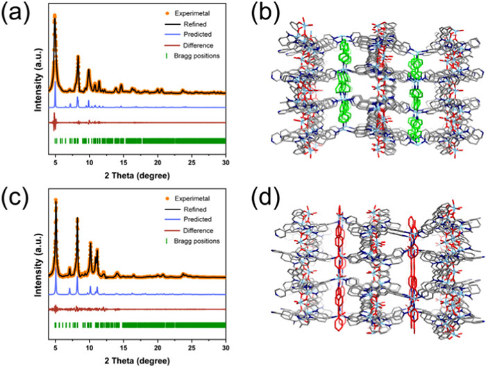 | Fig. 4. PXRD characterization of (a) R-2bpy, (c) R-2dpe. Experimental PXRD profile: orange; Pawley-refined profile: black; Bragg positions: green; difference: reddish brown; calculated patterns: blue. 3D structures along the b axis: (b) R-2bpy, (d) R-2dpe. | |