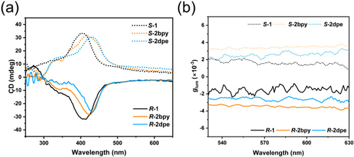 | Fig. 5. (a) ECD and (b) glum spectra of R/S-1 and R/S-2bpy. | |