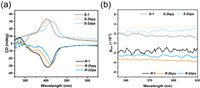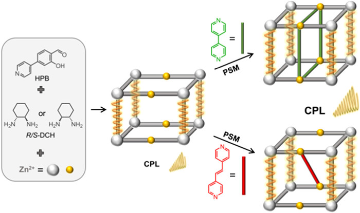 Herein, we report a pair of chiral MOFs, {[Zn2(R/S-L)(H2O)3](NO3)2}n (R/S-1, R/S-H2L=6,6′-[(1R/S, 2R/S)−1,2-cyclohexanediylbis(nitrilomethylidyne)]bis[3-(4-pyridinyl)phenol]), which are synthesized via the subcomponent self-assembly of 2–hydroxy-4-(pyridin-4-yl)benzaldehyde (HPB), chiral 1,2-diaminocyclohexane (R/S-DCH), and Zn2+ ions under solvothermal conditions (Scheme 1). MOFs R/S-1 feature 3D structures with acs topology and have open metal sites and channels for post-synthetic modification. The organic ligands 4,4′-bipyridine (bpy) and 1,2-di(4-pyridyl)ethylene (dpe) were employed as the pillars for the PSM of R/S-1. After post-synthetic installing pillars, the glum (±1.5 × 10−3) and PLQY (4.4%) of MOFs R/S-1 are amplified to ±3.5 × 10−3 and 8.4%, respectively, providing a useful strategy for boosting the CPL performance of MOF materials.
