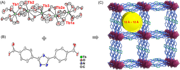 | Fig. 1. The coordination environment of (A) [Tb5] unit, the structure of (B) H2TDA and (C) TDA-Tb. | |