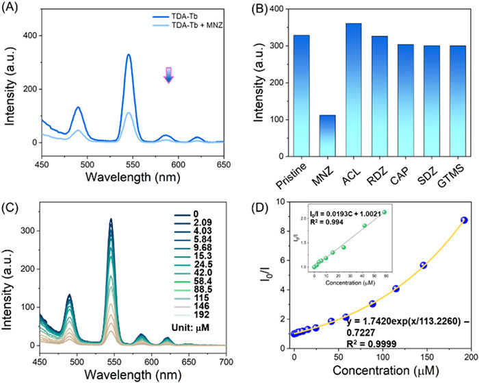 | Fig. 2. (A) Luminescence spectra of TDA-Tb and MNZ (50 µL, 1 mg/mL) treated TDA-Tb in aqueous. (B) Luminescence intensity of TDA-Tb after treating with various antibiotics (50 µL, 1 mg/mL). (C) Luminescence spectra of TDA-Tb after addition of different concentrations of MNZ. (D) Relationship between the quenching effect (I0/I) and the concentration of MNZ. | |