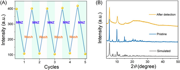 | Fig. 3. (A) Luminescence intensity and (B) PXRD pattern of TDA-Tb after five cycles. | |