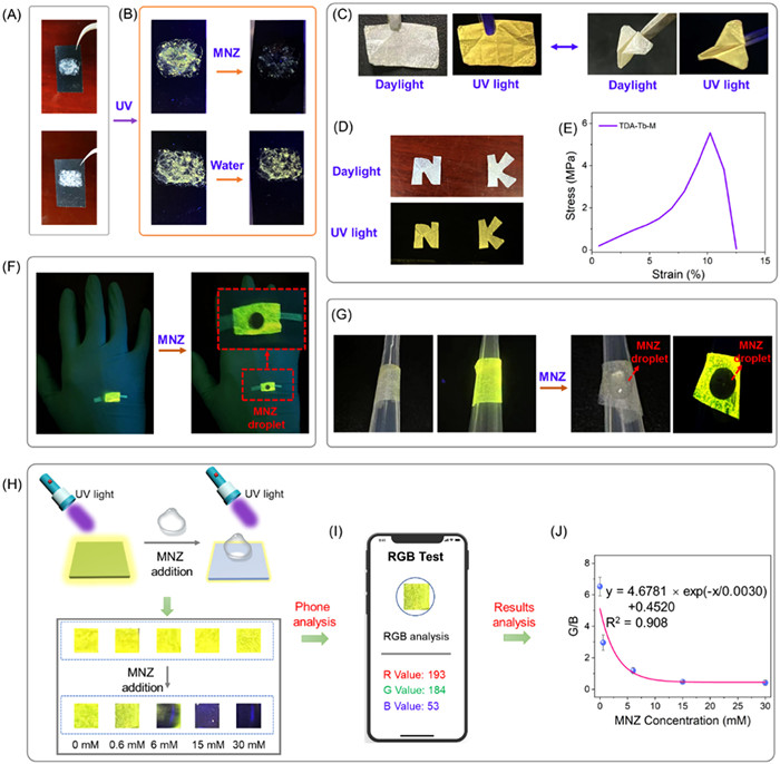 | Fig. 5. (A) Digital photos of TDA-Tb coated test paper and (B) the sensing ability of TDA-Tb to MNZ. (C) Photograph of TDA-Tb-M. (D) Tailored TDA-Tb-M. (E) Tensile stress–strain curves of TDA-Tb-M. Digital photos of the (F) "fluorescent skin" and (G) portable device before and after addition of MNZ (30 mmol/L). (H) Luminescent changes of TDA-Tb-M before and after immersing in water and MNZ solution with different concentrations. (I) Visual detection of MNZ by RGB color recognition APP with a smart phone. (J) Relationship between MNZ concentration and the corresponding G/B value. | |