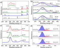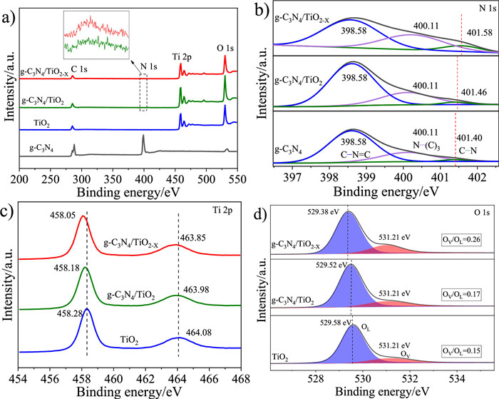 | Fig. 2. (a) XPS full spectra of g-C3N4, TiO2, g-C3N4/TiO2 and g-C3N4/TiO2-X. (b) N 1s XPS spectra of g-C3N4, g-C3N4/TiO2 and g-C3N4/TiO2-X. (c) Ti 2p and (d) O 1s XPS spectra of TiO2, g-C3N4/TiO2 and g-C3N4/TiO2-X. | |