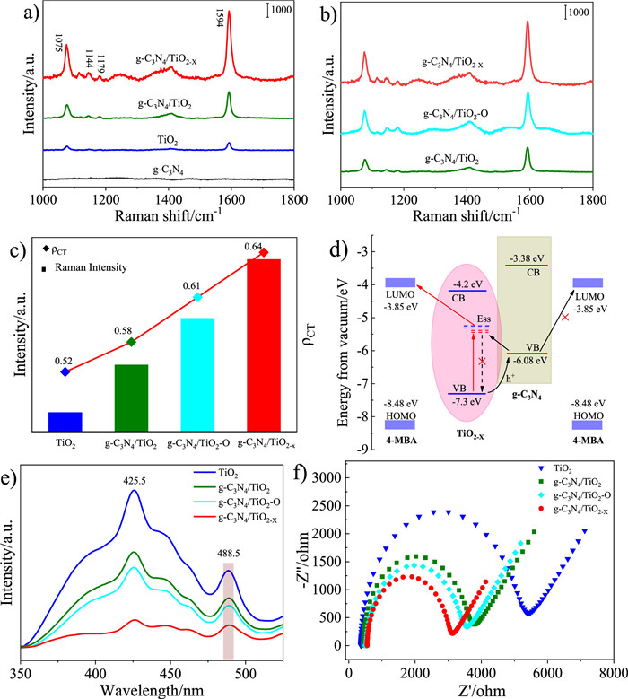 | Fig. 3. (a) SERS spectra of 4-MBA (1 × 10−3 mol/L) adsorbed on g-C3N4, TiO2, g-C3N4/TiO2 and g-C3N4/TiO2-X. (b) SERS spectra of 4-MBA (1 × 10−3 mol/L) adsorbed on g-C3N4/TiO2, g-C3N4/TiO2-O and g-C3N4/TiO2-X. (c) SERS intensity (1594 cm−1) and ρCT of 4-MBA on different substrates. (d) CT mechanism of 4-MBA-g-C3N4/TiO2-X system. (e) PL spectra and (f) EIS Nyquist plots of different substrate samples. | |