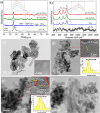 | Fig. 1. (a) XRD patterns and (b) Raman spectra of g-C3N4, TiO2, g-C3N4/TiO2 and g-C3N4/TiO2-X. (c-f) TEM images of g-C3N4, TiO2, g-C3N4/TiO2-X and g-C3N4/TiO2 (Insets are the corresponding HRTEM images and size distribution histograms). | |