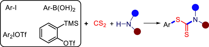 Considering the widespread presence of the dithiocarbamate skeleton in pharmaceuticals and bioactive molecules, the development of novel and convenient methods for the synthesis of these useful sulfur-containing compounds is of significant interest. Traditionally, S-aryl dithiocarbamates are constructed through the reaction of amines with thiophenols and thiophosgene [1]. Recently, transition-metal-catalyzed Ullmann-type coupling between aryl boronic acids or iodoarenes with tetraalkylthiuram disulfides or sodium dialkyldithiocarbamates has been reported [2]. The multicomponent reactions (MCRs) can minimize the pollution and reduce the cost, and can effectively improve the atomic economy and step economy of the reaction process, which has attracted extensive attention [3-5]. In recent years, the synthesis of S-aryl dithiocarbamates based on MCRs tandem reaction has been greatly developed (Scheme 1) [2]. Although many methods have been reported, the development of an alternative approach to S-aryl dithiocarbamates with high efficiency and generality is still of great research significance.