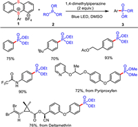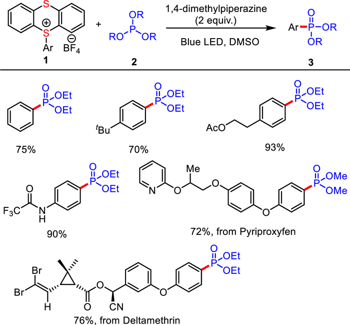 In 2023, Yang from College of Chemistry and Molecular Engineering, at Qingdao University of Science and Technology reported a simple and sustainable strategy for the synthesis of aryl phosphonates via visible-light-induced single electron transfer process of an EDA complex between thianthrenium salts and phosphites (Scheme 2) [7]. The aryl phosphonates were obtained in good to excellent yields. This developed method indirectly realizes the construction of aryl phosphonates through site-selective C—H functionalization of arenes, which has potential application value in drug development and discovery.