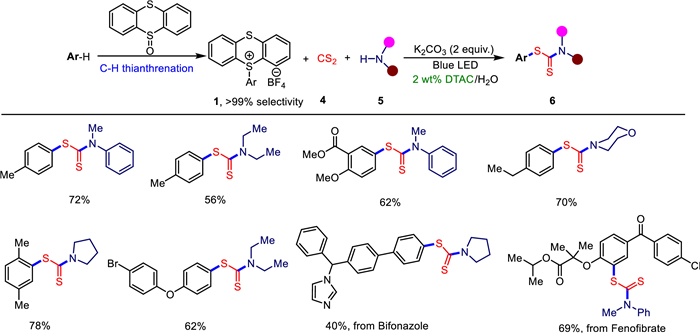 Very recently, Yang and co-workers demonstrated an eco-friendly and efficient method for the synthesis of S-aryl dithiocarbamates via visible-light-induced SET process of an EDA complex between thianthrenium salt functionalized arenes and dithiocarbamate anions under mild aqueous micellar conditions (Scheme 3) [8]. Various aryl thianthrenium salts which were directly synthesized from diverse arenes reacted efficiently with carbon disulfide and secondary amines, affording the target products in moderate to excellent yields. In addition, the present photochemical reaction tolerated an array of structurally and electronically diverse aryl thianthrenium salts. The method was also applied to the late-stage functionalization of pharmaceuticals or their derivatives.