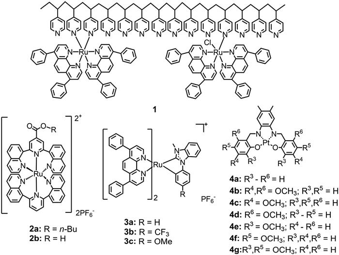 Apart from ruthenium complexes, Reid et al. have also synthesized and investigated the photophysical and ECL properties of a series of platinum(Ⅱ) Schiff base complexes (4a-4g). Among them, two platinum complexes with one methoxy substituent para to the oxygen on Schiff ligands (4f) and two methoxy substituent para and ortho to the oxygen on Schiff ligands (4g) exhibited NIR emission with peaks located at 696 nm and 739 nm. Using tripropylamine (TPrA) as co-reactant, the ECL efficiency of 4f is up to 35.6% compared with the reference of Ru(bpy)32+ (Φecl = 100%) in dichloromethane solution, which is best ECL efficiency between 4f and 4g both in annihilation and co-reactant pathways. Though the efficiency of these two platinum NIR ECL luminophores is not very satisfactory, a wide range of wavelengths by small and easily implemented changes to Schiff based ligand structure is indeed unsurpassed in ECL systems, especially for further designing NIR ECL luminophores in the future.