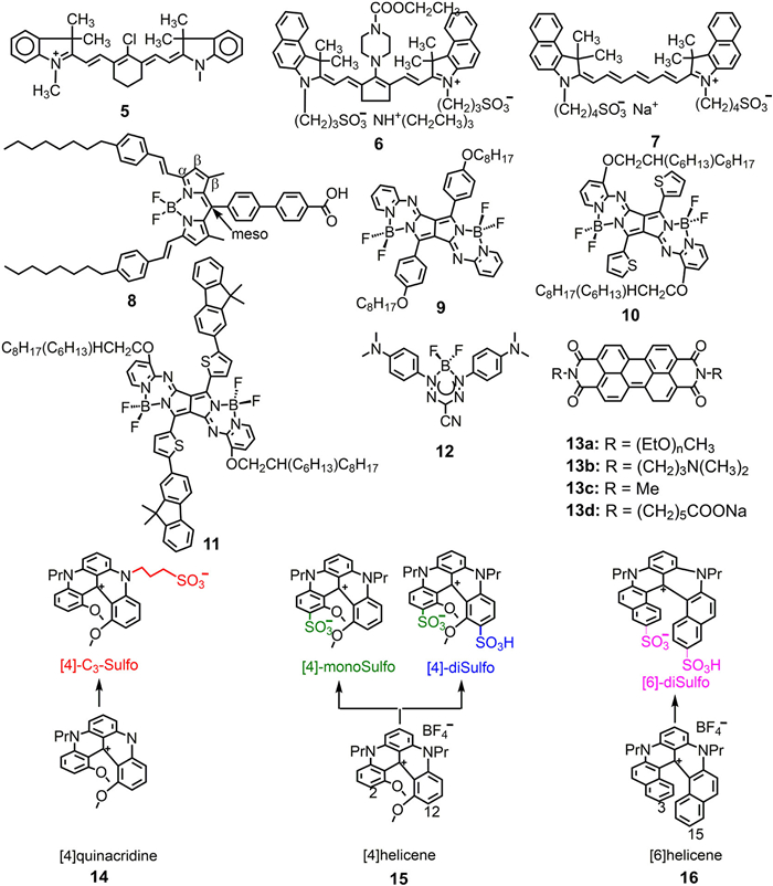 Very recently, Sojic et al. also synthesized sulfonate substituted helicenes as aqueous soluble NIR luminophores (14–16 in Fig. 3) [24-27]. As expected, these sulfonate derivatives have much better water solubilities compared with its parent skeletons. Furthermore, incorporating sulfonate group also induced emission wavelength up to 708 nm for the compound of [4]-diSulfo. The corresponding ECL efficiencies ranged from 5.4% to 33.9% using Ru(bpy)32+ as standard (Φecl = 100%).