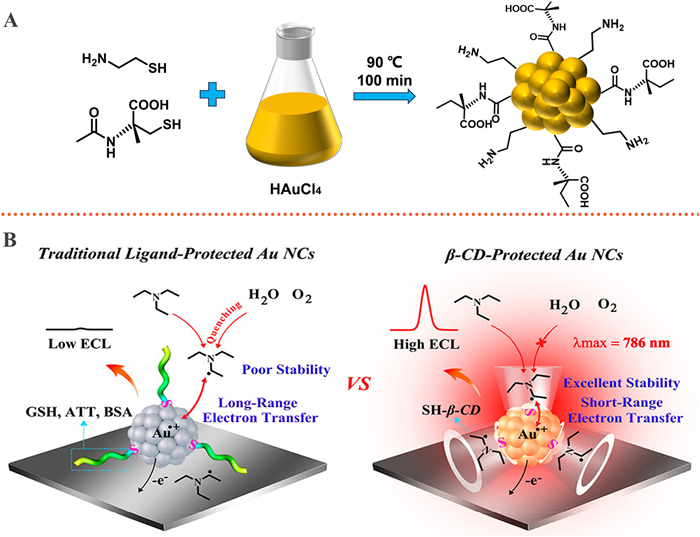 Considering that small molecule ligands, when employed as stabilizers for AuNCs, not only broaden the wavelength range into the near-infrared region but also enhance the aqueous solubility of AuNCs. Peng et al. [37] employed small molecule ligands to synthesize Methionine-stabilized AuNCs (Met-AuNCs), utilizing methionine as both a reducing and stabilizing agent. Additionally, the electrodes were pre-oxidized with triethylamine (TEA) as a co-reactant, resulting in an impressive 66% ECL quantum luminescence efficiency achieved at ca. 800 nm under significantly reduced potential conditions. Subsequently, to further enhance the redshift of NIR ECL, Yu et al. [38] employed Met-AuNCs as the luminophore and triethanolamine (TEOA) as the co-reactant to achieve highly efficient ECL in an aqueous solution at 835 nm. Ju et al. [39] demonstrated a dual stabilizer capping strategy employing N-acetyl-L-cysteine and cysteamine as model capping agents for the synthesis of AuNCs (NAC/Cys-AuNCs) (Fig. 4A). This approach not only achieved remarkable performance in NIR ECL emission, but also improved water solubility and biocompatibility, resulting in a red shift of the ECL emission wavelength to 860 nm. Recently, Peng et al. [40] have reported an energy level engineering strategy to modulate ECL performance based on ligand-protected AuNCs as luminophores. By utilizing N,N-diisopropylethylamine (DIPEA) as a co-reactant, the energy level matching with AuNCs effectively enhances their electron transfer reactions, leading to the achievement of highly stable ECL signals with low trigger potentials. Yuan et al. [41] utilized the ligand-based shielding effect and employed β-cyclodextrin-protected AuNCs (β-CD-AuNCs) as luminophores to enhance the stability of co-reactant radicals, thereby achieving efficient ECL (Fig. 4B). This study elucidated the pivotal role played by ligands in augmenting the stability of active co-reactant radicals.