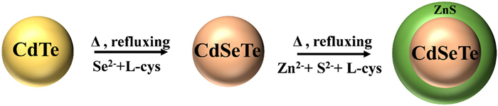 | Fig. 5. Schematic illustration of the synthesis of water-soluble CdSeTe/ZnS CS QDs. Adopted with permission [65]. Copyright 2010, the Royal Society of Chemistry. | |