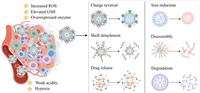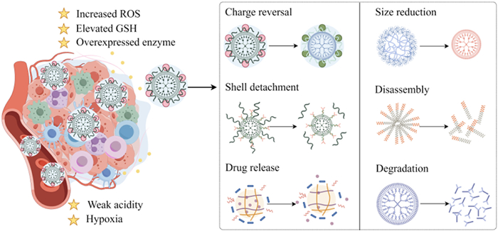 TME, as a soil for cancer cell culture, is mainly composed of blood vessels, stromal cells, fibroblasts, extracellular matrix (ECM), immune cells, and signaling molecules, which profoundly affects the initiation and progression of tumors [35]. Tumor neovascularization is crucial for the occurrence and development of tumors. Mature tumor vascular matrix structure is chaotic, leading to increased interstitial fluid pressure, inadequate blood perfusion, persistent hypoxia, and drug delivery difficulties, all of which contribute to cancer progression, metastasis, and drug resistance. The ECM is another important component of TME with multiple crucial roles, including mechanical support, TME modulation, and a source of signaling molecules that trigger tumor metastasis and further malignant transformation. Cytokines, enzymes and growth factors secreted by fibroblasts and immune cells in the tumor tissues make tumors more aggressive and invasive. In addition to the various components in the tumor region, the physiology of TME is also different from that of normal tissues. Unlike normal tissues, TME typically exhibits a more acidic microenvironment, a higher state of hypoxia, elevated interstitial fluid pressure and ATP, abundant ROS and glutathione (GSH), and overexpressed enzymes [36,37]. Unfortunately, these hostile features of TME are strongly associated with tumor angiogenesis, treatment resistance, and tumor progression [38,39]. Therefore, TME is an important marker in cancer treatment and has been widely utilized as a stimulus to stimulate size shrinkage, charge conversion, shell deshielding, or structure disintegration of stimuli-responsive polymeric nanoparticles to facilitate the programmable controlled release of anticancer agents (Fig. 2). In this section, we briefly describe the characteristics of TME related to "stimulus-responsive nanodrug strategies", rather than describe all the components of TME in detail.