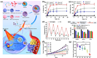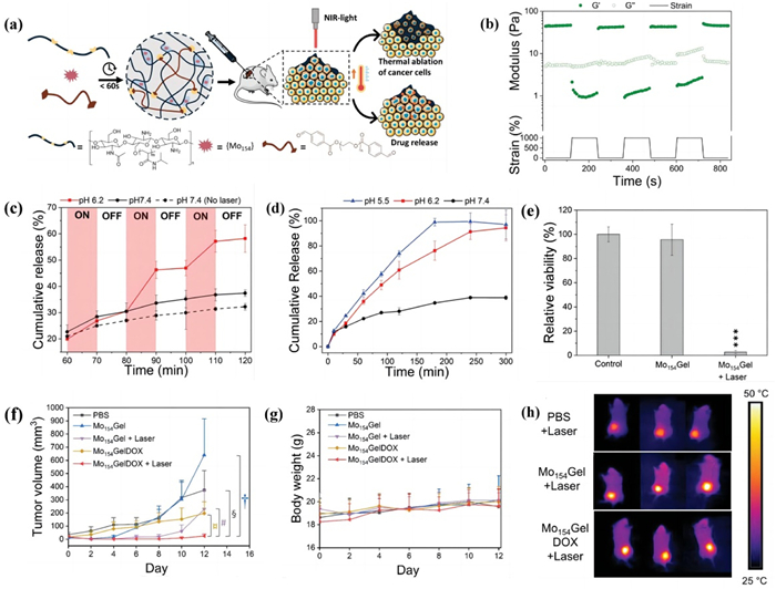 | Fig. 3. pH/NIR-responsive Mo154GelDOX for enhanced photothermal and chemotherapy. (a) The design of Mo154GelDOX. (b) The self-healing behavior of Mo154Gel. G′: the storage modulus, G′′: the loss modulus. (c) The NIR-responsive release of DOX form Mo154Gel. (d) The pH-reliable release of DOX form Mo154Gel. (e) The relative viability of M21 cells after Mo154Gel treatment. ***P < 0.001. (f) The anticancer efficacy of Mo154GelDOX on tumor-bearing mice. ¤P < 0.0001, |P = 0.053, §P < 0.0001, †P < 0.001. (g) The safety of Mo154GelDOX on tumor-bearing mice. (h) IR thermal images of the mice treated with Mo154GelDOX. Reproduced with permission [90]. Copyright 2021, The Authors. | |