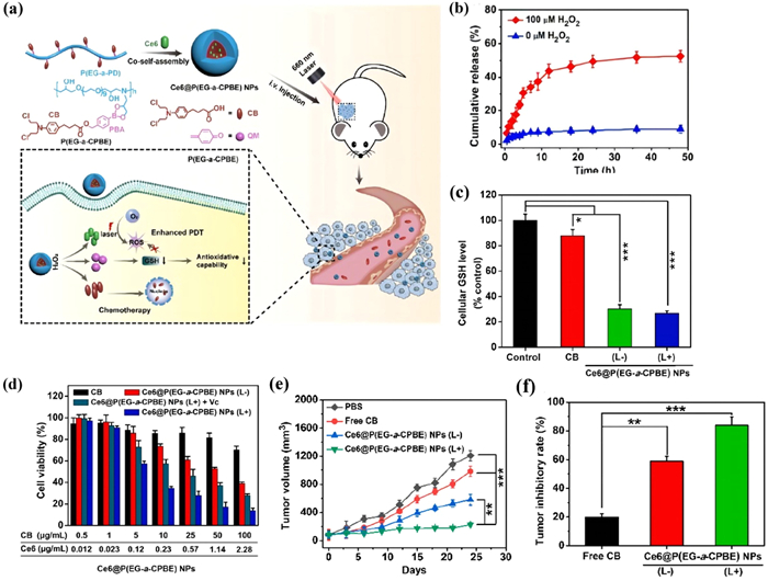 | Fig. 4. H2O2-reliable Ce6@P(EG-a-CPBE) for cooperative chemo-photodynamic therapy. (a) The design of Ce6@P(EG-a-CPBE) with GSH-scavenger. (b) The H2O2-reliable release of CB form Ce6@P(EG-a-CPBE). (c) The level of GSH in MCF-7 cells treated with Ce6@P(EG-a-CPBE). (d) The relative viability of MCF-7 cells after Ce6@P(EG-a-CPBE) treatment. (e) The anticancer efficacy of Ce6@P(EG-a-CPBE) on tumor-bearing mice. (f) The tumor inhibitory rate (TIR) of Ce6@P(EG-a-CPBE). P < 0.05, **P < 0.01, ***P < 0.001. Reproduced with permission [122]. Copyright 2023, The Authors. | |