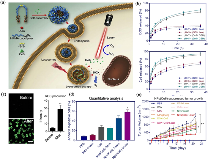 Luo and colleagues designed a disulfide bond-bridged amphiphilic and block polymer prodrug (polyHPMA-DOX), which could self-assemble into GSH-responsive micelles to load Ce6 for combined chemo-photodynamic therapy [127]. In their study, intracellular overexpressed GSH effectively disrupted the prodrug micelles, resulting in precise DOX release within tumor cells. When combined with PDT mediated by Ce6, the released DOX exhibited a significant anticancer effect with a TGI more than 70% (Fig. 5).