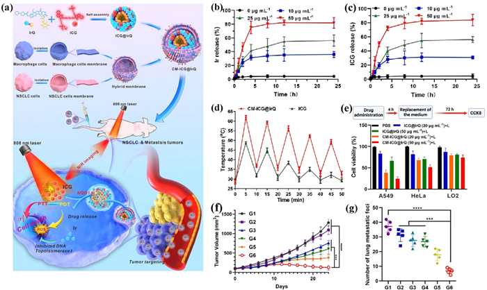 | Fig. 6. NQO1-responsive CM-ICG@IrQ for synergetic chemo-photo therapy. (a) The design of CM-ICG@IrQ. (b) The NQO1-reliable release of Irinotecan form CM-ICG@IrQ. (c) The NQO1-reliable release of ICG form CM-ICG@IrQ. (d) The photostability of CM-ICG@IrQ (Five irradiation/cooling cycles). (e) The relative viability of A549, HeLa and LO2 cells after CM-ICG@IrQ treatment. (f) The anticancer efficacy of CM-ICG@IrQ on tumor-bearing mice. (g) Effect of CM-ICG@IrQ on pulmonary metastasis inhibition. G1: PBS, G2: ICG + L, G3: IrQ nanoparticles, G4: ICG@IrQ, G5: ICG@IrQ + L, G6: CM-ICG@IrQ + L. **P < 0.01, ***P < 0.001, ****P < 0.0001. Reproduced with permission [143]. Copyright 2023, The Authors. | |
