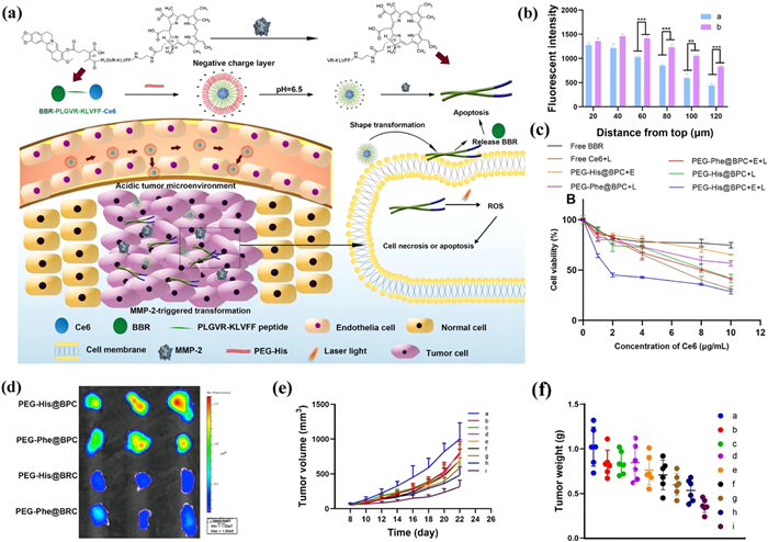 | Fig. 7. pH and MMP-2 dual-responsive PEG-His@BPC for amplified chemo-photodynamic therapy. (a) The design of PEG-His@BPC. (b) Tumor retention of PEG-His@BPC. a: PEG-His@BRC, b: PEG-His@BPC. **P < 0.01, ***P < 0.001. (c) The relative viability of 4T1 cells after PEG-His@BPC treatment. (d) Ex vivo fluorescent imaging of tumors at 48 h. (e) The anticancer efficacy of PEG-His@BPC on tumor-bearing mice. (f) Tumor weights of different treatment groups. The a–i represents PBS, BBR, Ce6 + L, PEG-His@BPC, PEG-Phe@BRC + L, PEG-His@BRC + L, PEG-His@APC + L, PEG-Phe@BPC + L and PEG-His@BPC + L, respectively. Reproduced with permission [151]. Copyright 2022, Chinese Pharmaceutical Association and Institute of Materia Medica, Chinese Academy of Medical Sciences. | |