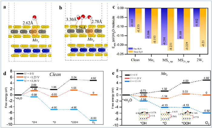 | Fig. 3. (a, b) Adsorption of single and multiple water molecules on Mov+2S_up (Mo vacancy on MoS2). (c) Adsorption energy of per water molecule on clean and defective WS2/MoS2 vdW heterojunctions. Mov: Mo vacancy; MSv_up: the S vacancy at the top MoS2 layer; MS2v_up: two S vacancies (closer) at the top MoS2 layer; 2Wv: two W vacancies; Free energy of the OER pathways for (d) clean (no vacancy) and (e) Mo vacancy of WS2/MoS2 vdW heterojunctions. Reprinted with permission [69]. Copyright 2022, Elsevier B.V. | |