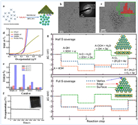 MoS2 quantum dots (MSQDs) are also demonstrated to have promising applications in OER [59,63,64]. Mohanty et al. uses (NH4)2MoS4 and hydrazide to obtain MSQDs through hydrothermal synthesis technology, which avoids the formation of carbon quantum dots (CQDs) caused by the use of carbon organic solution, and thus avoids the impact of CQDs on the performance of MSQDs (Fig. 2a) [59]. Based on the analysis of TEM images and the histogram of the size distribution, it can be observed that the synthesized MSQDs particles exhibit a size below 7 nm and demonstrate well-defined lattice fringes (Figs. 2b and c). Subsequently, the number of active sites and turn over frequency of MSQDs were estimated to test their OER performance. As shown in Figs. 2d and e, in the case of high overpotential, the TOF value of MSQDs-AC is higher than that of commercial IrO2/C, indicating that the OER performance of MSQDs-AC at this time has exceeded that of commercial IrO2/C. It also shows that MSQDs after activation cycle has more superb catalytic activity, which may be due to the increase of the number of active sites. Additionally, MSQDs also have excellent stability. After continuous electrolysis for 2 h at the current density of 10 mA/cm2, almost no change in overpotential is observed, which can be applied to long-term electrolysis applications (Fig. 2f). In order to further study the catalytic mechanism, the authors used DFT to calculate the OER free energy distribution at different positions of the catalyst under the condition of half S coverage and full S coverage (Fig. 2g). The results show that the catalytic activity at the vertex and edge is more superior than that at the surface. This work provides a profound insight into the synthesis method and catalytic properties of MSQDs, which is conducive to the further application of MSQDs in OER, and the structure can also be applied to other transition metals for catalytic production of related energy sources.