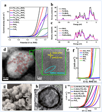 The Co and Nb doped MoS2 nanosheet shelled micro-TiO2 hollow spheres prepared by Nguyen et al. is also an excellent bimetal-doped OER catalyst [81]. Co and Nb doped MoS2 nanosheets are deposited directly on PS@TiO2 sphere by hydrothermal reaction. The obtained Co, Nb-MoS2/PS@TiO2 precursor is annealed at 650 ℃ in Ar atmosphere for 3 h, then it will be converted into Co, Nb-MoS2/TiO2 HSs. The hollow spherical structure of Co, Nb-MoS2/TiO2 HSs can be clearly observed from its SEM and TEM images (Figs. 5g and h). In addition, it could also indicate that the ultra-thin nanosheets are uniformly covered on the spherical surface. The results show that the catalytic performance of Co, Nb-MoS2/TiO2 HSs is more outstanding by testing and comparing the OER activity of correlative materials (Fig. 5i). The chemical coupling effect between Co, Nb-MoS2 NSs and TiO2 hollow spheres, the co-doping effect of Co and Nb is also one of the essential reasons. The electronic states of Co and Nb doped MoS2 are in proximity to the Fermi level, and the electronic states are higher than those of single metal Co or Nb doped catalysts, which is conducive to electron transfer and adsorption of intermediates. The high efficiency and stability of the material also make it have potential for application in the case of high current density of industrial grade. These works provide a valuable insight into how to use the synergistic effect of bimetal doping to further improve catalyst performance compared with single metal doping. At the same time, as an effective means to improve the catalytic performance of OER, it is worth further research and extension.