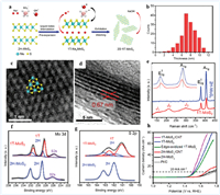| Fig. 6. (a) Synthetic procedure of 2D 1T-MoS2 nanosheets. (b) Statistical analysis of thickness distribution of 1T-MoS2. (c) HRTEM of 1T-MoS2, arranged in a triangular pattern (blue, yellow balls represent Mo, S respectively). (d) HRTEM image of the 1T-MoS2 edge (e) Comparison of the RS for 1T- and 2H-MoS2 (inset in d: E2g1 and A1g peak shifts). XPS spectra of (f) Mo 3d and (g) S 2p. (h) Polarization curves. Reprinted with permission [83]. Copyright 2018, The Royal Society of Chemistry. | |