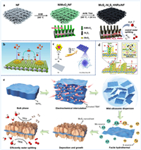 | Fig. 7. (a) The synthesis process of heterostructured MoS2-Ni3S2 HNRs/NF Composites. AHM refers to ammonium heptamolybdate tetrahydrate and NF nickel foam. Reprinted with permission [90]. Copyright 2017, American Chemical Society. (b) The HER and OER process on Co3O4@MoS2 interface structures. Reprinted with permission [91]. Copyright 2017, The Royal Society of Chemistry. (c) The synthesis process of the CoS2/MoS2/Ni3S2/NF electrode. Reprinted with permission [92]. Copyright 2023, Elsevier B.V. (d) MoS2/NiPS3 heterostructure model. (e) The synthetic scheme of MoS2/NiPS3 heterostructure. Reprinted with permission [93]. Copyright 2022, Wiley-VCH GmbH. | |