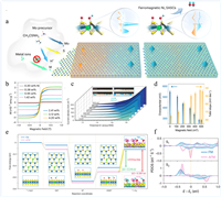 | Fig. 8. (a) The hydrothermal synthesis of M1/MoS2 SASCs under acidic conditions. (b) Magnetization curves (M-H) of ferromagnetic Ni1/MoS2 with different Ni contents at 300 K. (c) Linear scan voltammetry curves of Ni1/MoS2 under different magnetic fields. The illustration shows photo images of Ni1/MoS2 as OER catalysts under 1.65 V magnetic field without (left) and (right) magnetic fields. (d) Overpotentials and Tafel slopes of Ni1/MoS2 (14:100) at current density of 40 mA/cm2. (e) Free energy distribution of OER on ferromagnetic and antiferromagnetic Ni1/MoS2 and the corresponding adsorption configurations of reaction intermediates. (f) Projected density of states of S1 (an adjacent S atom with a Ni-S bond length of 2.521 Å) and S2 (an adjacent S atom with a Ni-S bond length of 2.285 Å) atoms of Ni1/MoS2 models consisting of two adjacent NiMo sites with ferromagnetic (FM) and antiferromagnetic (AFM). Reprinted with permission [118]. Copyright 2023, The Author(s). | |
