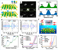| Fig. 5. (a) Polarization curves (1.0 mol/L KOH solution, scan rate of 5 mV/s). (b) PDOS plot for d-orbitals of Mo. (c) PDOS plot for p orbitalsof S. Reprinted with permission [79]. Copyright 2022, The Royal Society of Chemistry. (d) HAADF image (e)HRTEM image of AlCo3-MoS2 NSs. (f) Polarization curves of AlCo3-MoS2 and its related materials and RuO2. Reprinted with permission [80]. Copyright 2021, Science Press and Dalian Institute of Chemical Physics, Chinese Academy of Sciences. (g) SEM images of the Co, Nb-MoS2/TiO2 HSs. (h) TEM images of the Co, Nb-MoS2/TiO2 HSs. (i) Polarization curves obtained at a scan rate of 5 mV/s in 1.0 mol/L KOH electrolyte. Reprinted with permission [81]. Copyright 2021, Elsevier Ltd. | |