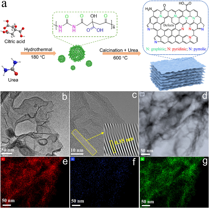 | Fig. 1. (a) Illustration of synthesis of metal-free N–C material. (b) TEM, (c) HRTEM, (d) HAADF-STEM, and EDX elemental mapping images including (e) C, (f) O and (g) N of N–C. | |