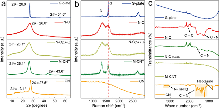 | Fig. 2. Catalyst characterizations. (a) XRD patterns, (b) Raman spectra, and (c) FTIR spectra for CN, N–C, M-CNT, N–C(CA+U) and G-plate. | |